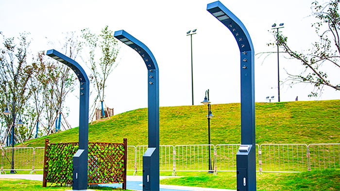 服务于世界马拉松比赛的智能计时桩,会在你经过的时候自动感应 并记录你的跑步成绩; 当你跑得大汗淋漓,皮肤灼热,可以启动公园里的喷淋杆,细腻均匀的水雾从天而降,好似时间定格: 公园里的饮用水都进行过高标准净化处理,口渴的时候随时可以补充水分,安全方便。